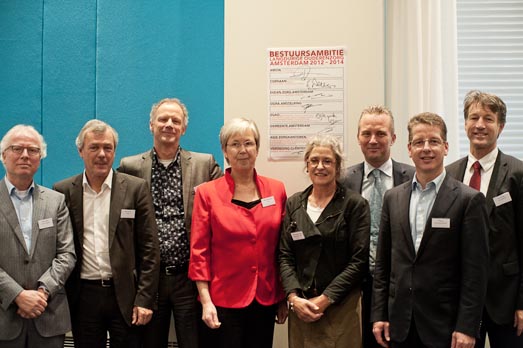 V.l.n.r.: Maarten Straus (directeur Evean Amsterdam), Eelco Damen (voorzitter RvB Cordaan), Joep Aarts (voorzitter RvB Amsta), Rieta van Staalduine (sr manager Care Agis/Achmea), Liesbeth van der Voorn (adjunct-directeur Zorggroep Amsterdam Oost), wethouder Zorg Eric van der Burg, Ad Warnar (directeur Cliëntenbelang Amsterdam) en Rob van Dam (voorzitter RvB Osira Amstelring).