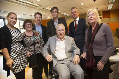 V.l.n.r.: Esma Salama (programmanager SIPI), Mieke Maes (Atelier K&K), Ad Warnar (directeur Cliëntenbelang Amsterdam), Ahmed el-Mesri (Assadaaka) en Eric van der Burg (voormalig wethouder Zorg) en Tunny Jongejan-Maat (voorzitter OAR).
